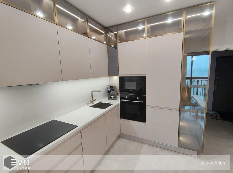 Угловая схема хорошо использует площадь и подходит для большинства квартир. Важно грамотно «разрулить» угол: карусель, выкатные системы или глубокие ящики - иначе место будет теряться. Верхние шкафы можно сделать до потолка, чтобы увеличить хранение и визуально вытянуть помещение.