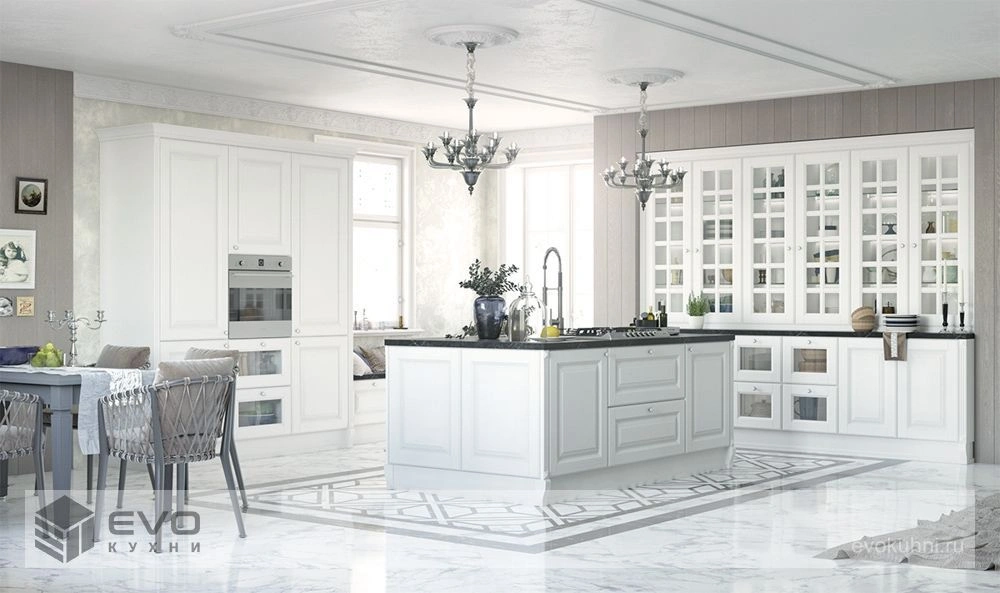 Здесь важны пропорции, ритм и аккуратные детали. Выбирайте филенчатые или рамочные фасады, спокойную фурнитуру, теплую палитру, а верхний свет дополняйте бра или подвесами. Для столешницы хорошо подходит камень или качественная имитация, а фартук - плитка «кабанчик» или крупный формат.