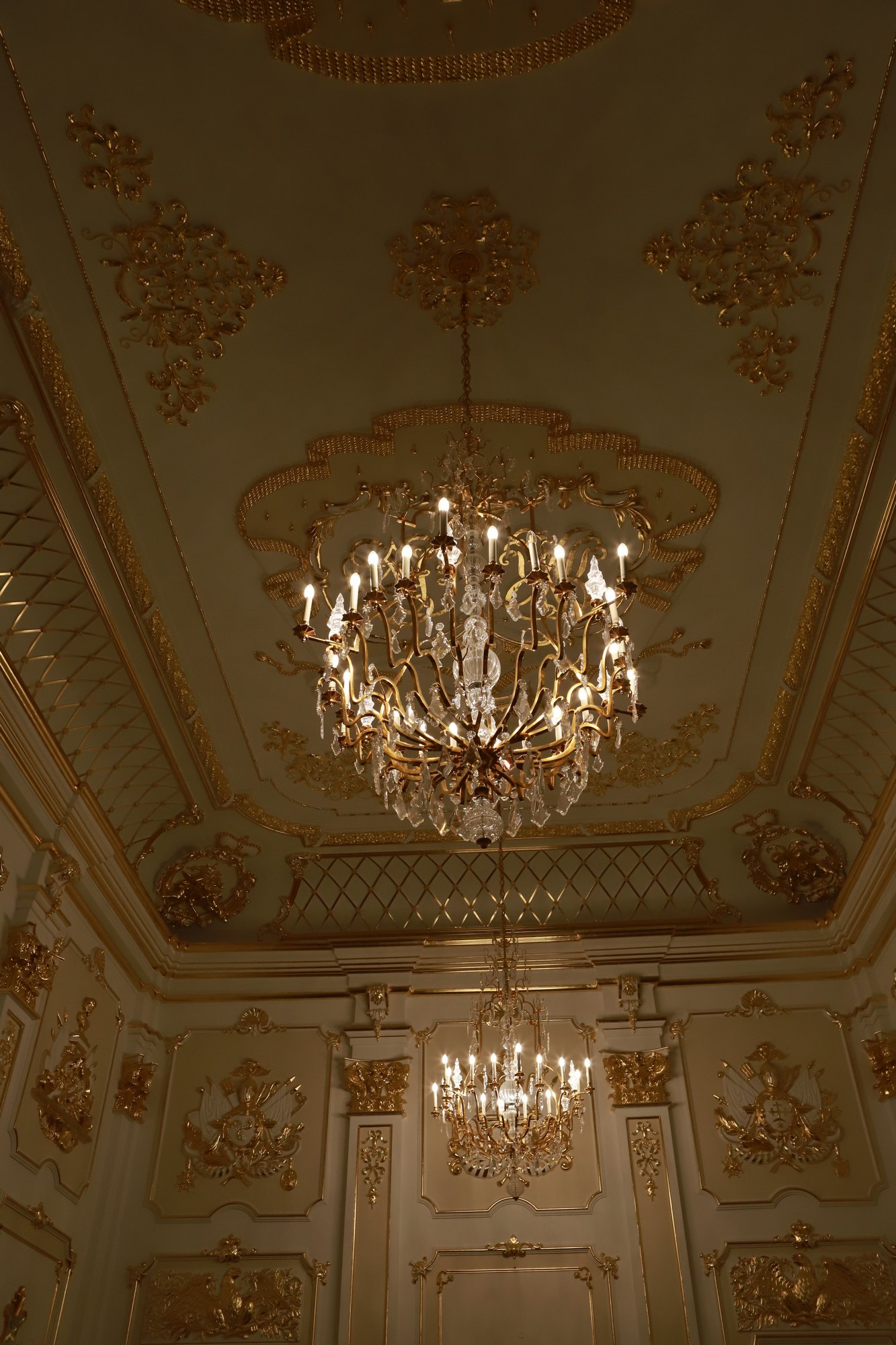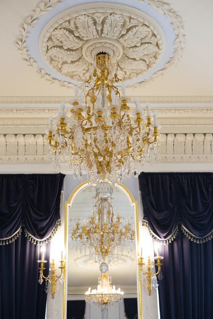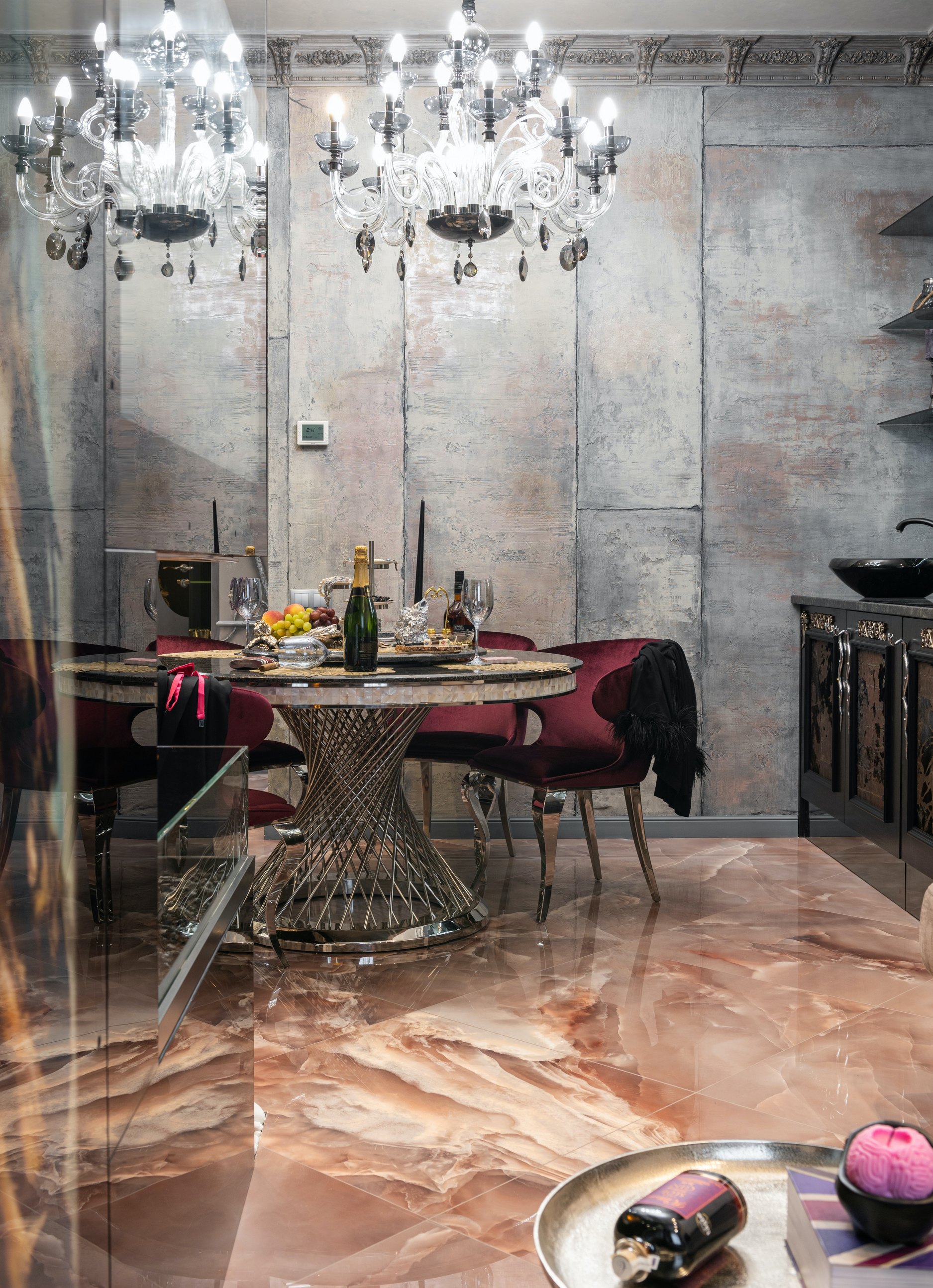 Мраморные поверхности и керамический паркет будут особенно уместны в квартире в стиле ампир. Хорошая идея: многоуровневые потолки, дополненные увесистыми канделябрами или люстрами, которые добавят помещению помпезности и шика. В интерьер современной кухни в ампире впишутся и дизайнерские светодиодные светильники, если они правильно подобраны. Дополнительным украшением станут тяжелые парчовые и бархатные занавески с кистями из золотых нитей.