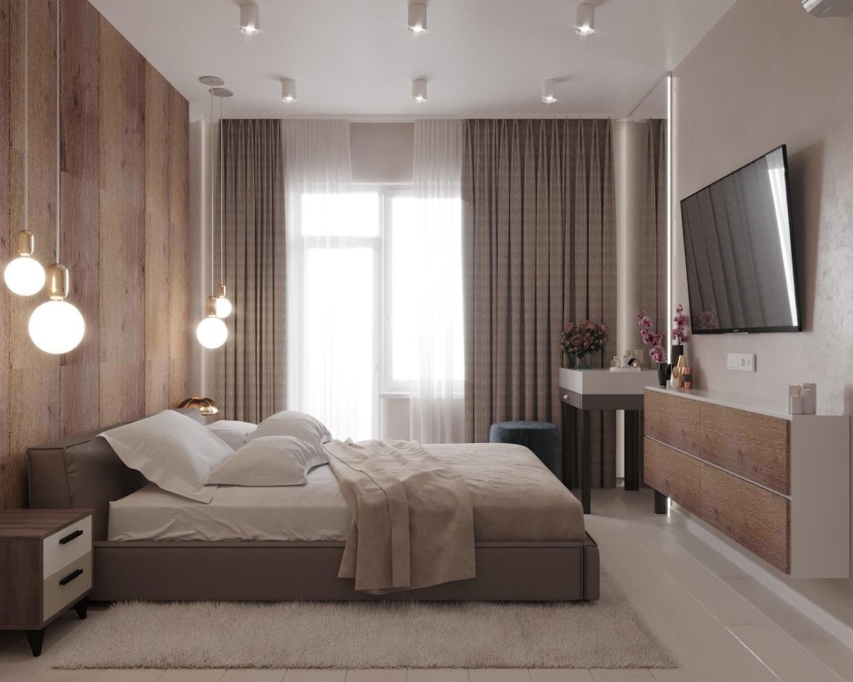 Светлая отделка в спальне придаст помещению уюта и умиротворенности. Яркие акценты помогут сделать комнату более выразительной. На потолке могут использоваться натяжные полотна, а на полу паркет или ламинат.