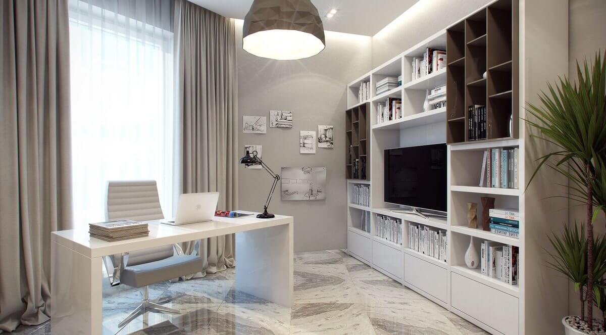 Отличное решение оформление кабинета в светлых оттенках. Это позволяет визуально увеличить пространство в помещении. Стены в пастельных тонах прекрасно гармонируют с темным полом.