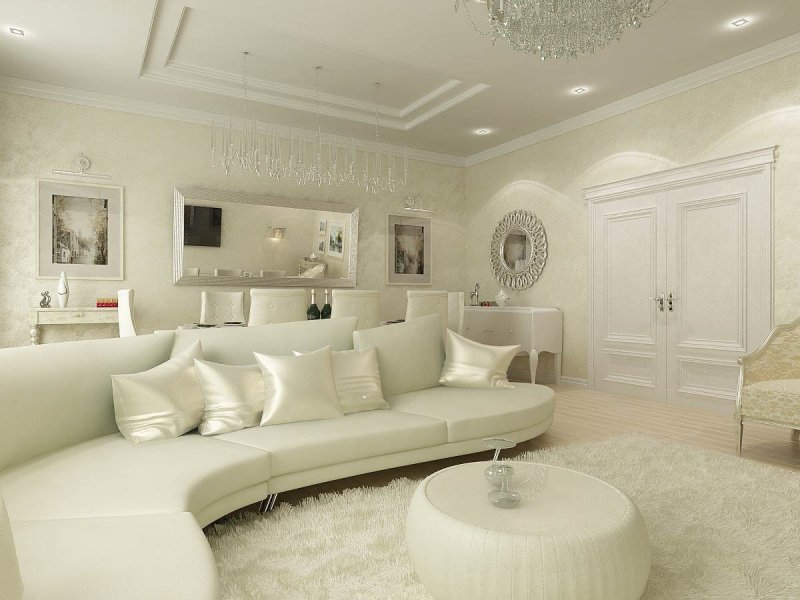 В помещении со светлым интерьером не стоит увлекаться декором. Достаточно пары фотографий на стене или полках. Не должно быть много и сувениров. Хватит парочки на видном месте. Для белого интерьера подойдет красочная картина больших размеров. Особое внимание нужно уделить освещению. Рекомендуется выбирать осветительные приборы с теплым желтоватым свечением. Важным элементом может стать люстра. Это предмет декора может быть металлическим, стеклянным, пластиковым или тканевым. В интерьере можно использовать зеркальные поверхности, которые могут быть частью декора или частью отделки.