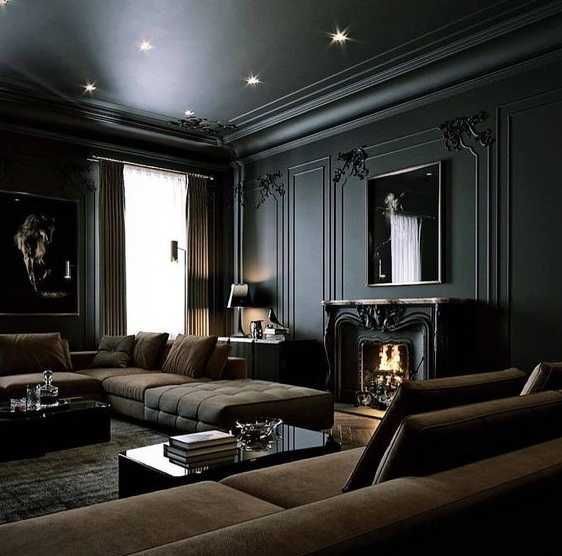 - Темные стены и потолок. Допускается на больших площадях и при наличии высоких потолков (от 3м). Монохромность поверхностей может быть разбавлена при помощи контрастных узоров, лепнины.