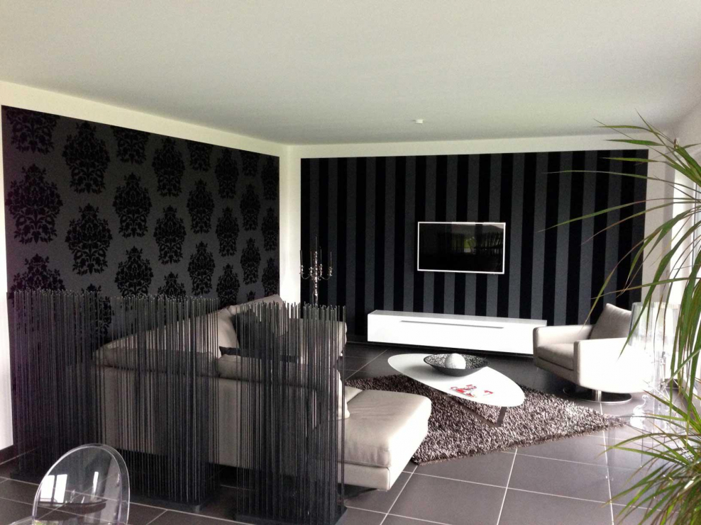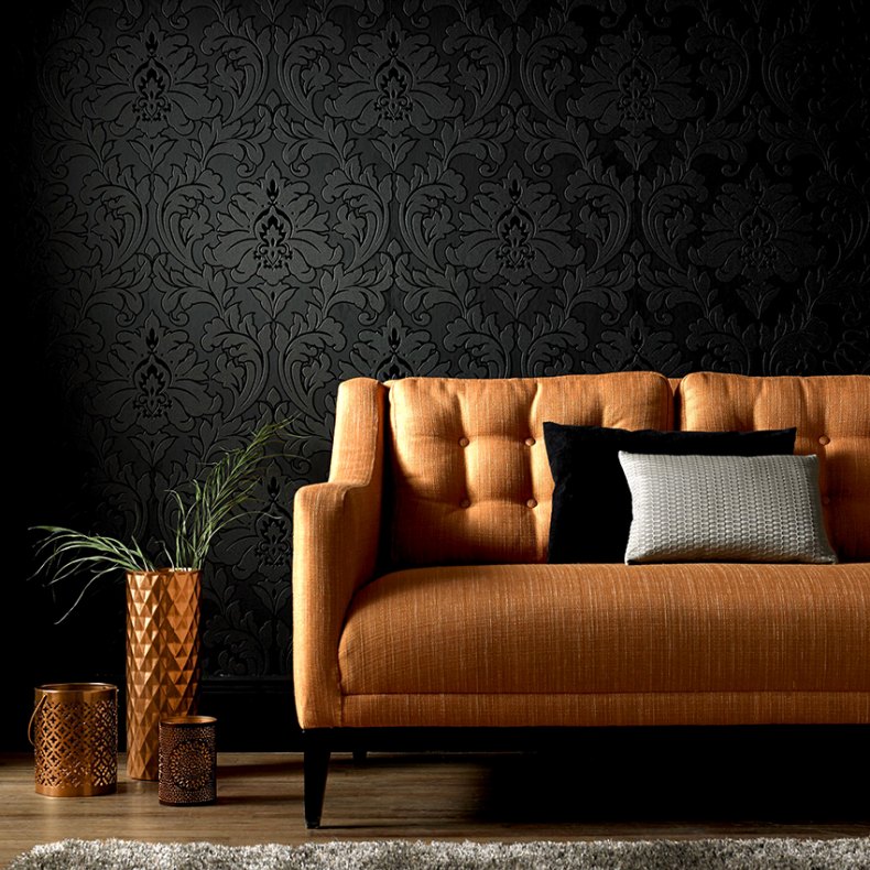 Декоративные элементы золотистого цвета и орнамент на обоях подчеркивают сильные стороны современного модного интерьера.