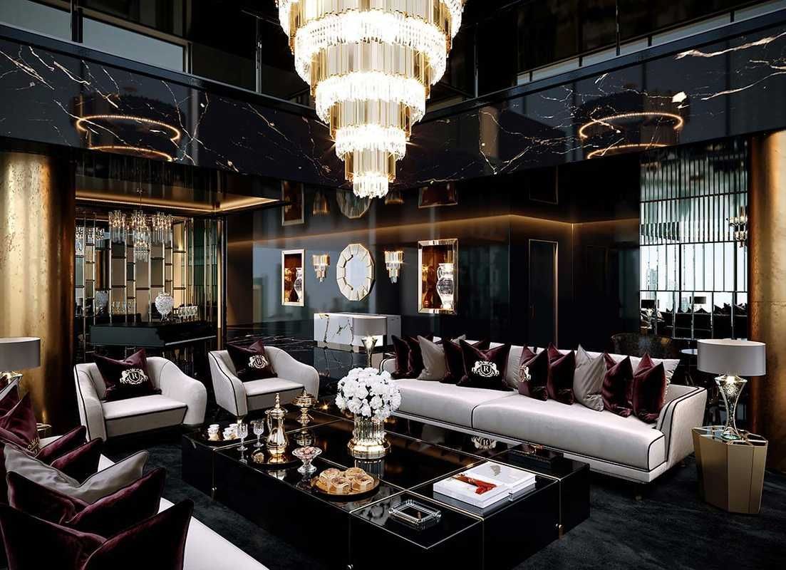 - Выбор оптимального варианта освещения. Используются разные осветительные приборы. Подбор светильников зависит от размера комнаты, интерьерного стиля. Например, в классическом интерьере особое внимание привлекут люстра из хрусталя и такие же настенные бра. Игра света на темных стенах выглядит более эффектно, чем на светлых поверхностях. Для квартир подойдут современные светильники оригинальной формы. Черный цвет находит применение при зонировании для выделения наиболее значимой части интерьера. На фоне черного потолка красиво выглядит подпотолочная лепнина (молдинги, карнизы). Чтобы он создавал ощущение бесконечной перспективы, покраску выполняют красками с высокой степенью глянца.
