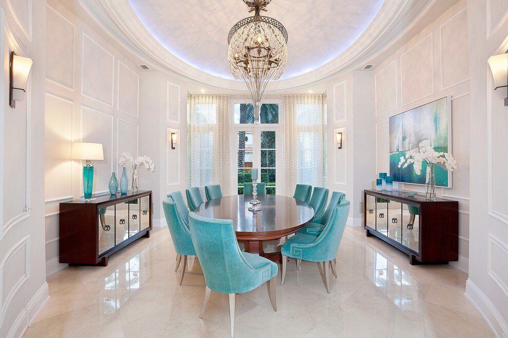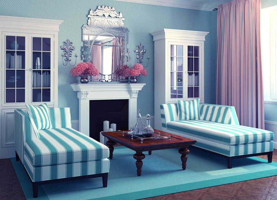 - Гостинная в стиле Тиффани: Гармония цветов и отделки создает уютное пространство для отдыха. Бирюзовые акценты в мебели и декоре подчеркивают неповторимость стиля.