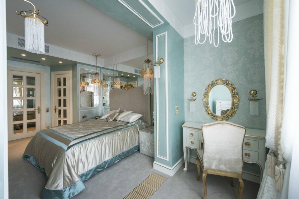 - Спальня в стиле Тиффани: Сочетание пастельных оттенков и элементов декора в виде стеклянных витражей создает романтическую и атмосферную обстановку.
