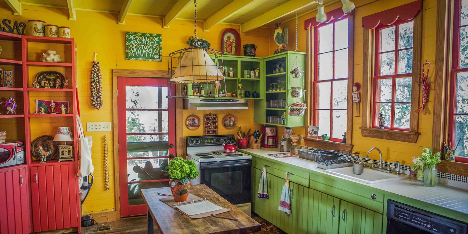 - Яркий поп-арт 50-ых принес в интерьер насыщенные тона – красный, зеленый, сочетание желтого с голубым и другие. Особую популярность в это время обрела черно-белая выкладка плитки на полу и использование «кабанчика» для оформления фартука;