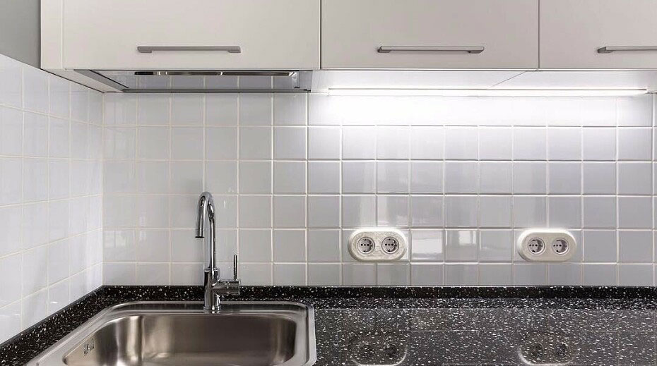 Для подсветки на кухне нужна не только розетка, но и выключатель. Очень правильно и удобно расположить выключатель в том же месте на фартуке, где будут находиться бытовые электророзетки. А сама розетка для подсветки может располагаться внутри одного из навесных шкафчиков, ведь отключать подсветку от электросети требуется очень редко.