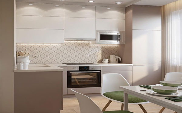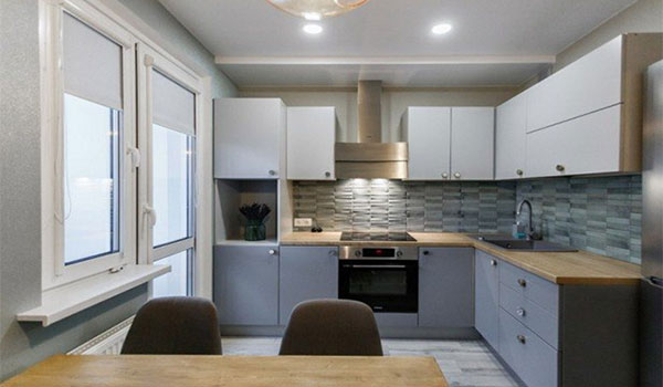 - Сложно подобрать в небольшое помещение, поскольку покрытие без глянца итак зрительно уменьшает пространство. Решением может стать чрезвычайно светлый гарнитур в сочетании с зеркальным или стеклянным фартуком, создающим блики.