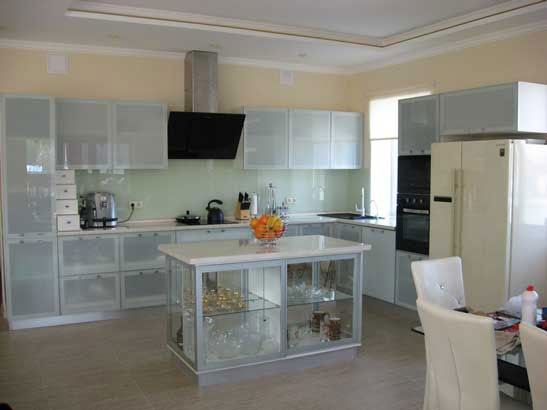 Кухня с дверцами из закаленного стекла смотрится очень красиво. Дверцы бывают с рамками и без, стекло делают матовым, наносят на него рисунки (например цветок).