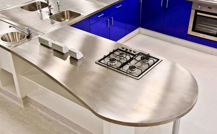 Стальные столешницы могут иметь самую разную форму и размеры, что позволяет уверенно воплощать в жизнь дизайн любой сложности.