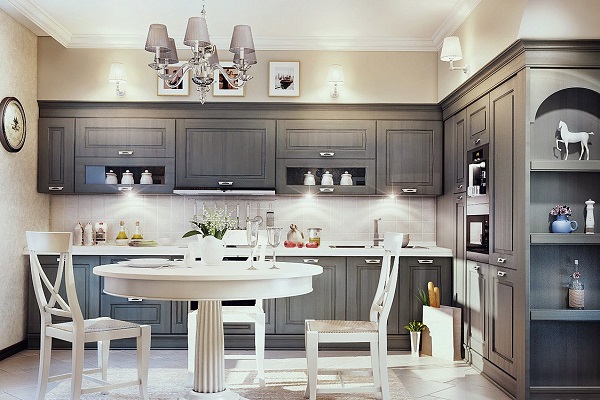 - Отдельные предметы — часы, декоративные тарелки, подчёркивающие домашний уют кухонного помещения.
