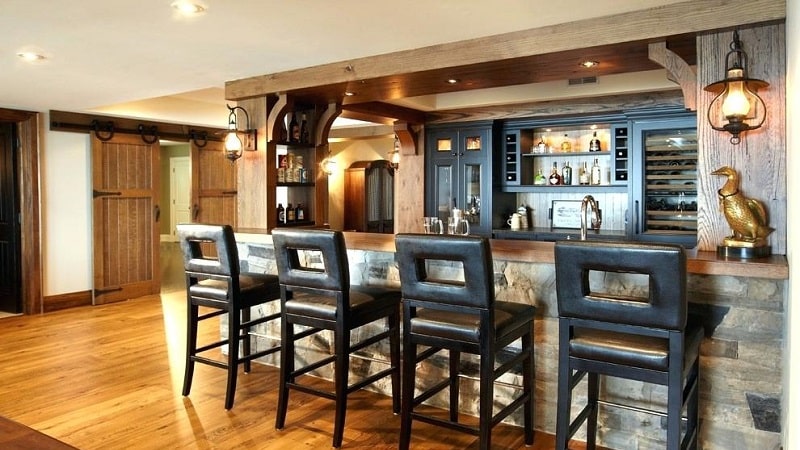 - Второй обязательный атрибут — бар с многочисленными бутылками и держателями для них.