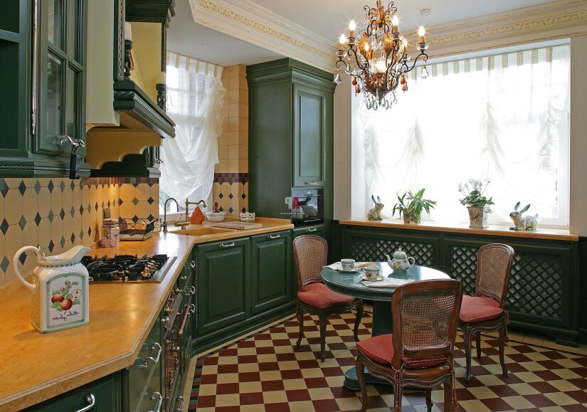 - много текстиля: скатерти, шторы, кухонные салфетки покрывают практически любую поверхность. Обилие тканей создает ощущение теплоты и обжитости кухонного помещения.