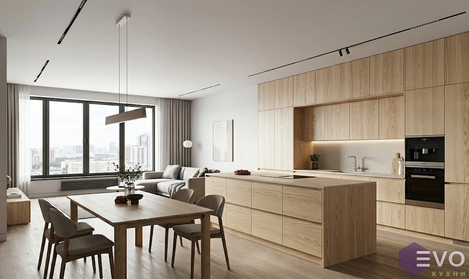 Для ежедневной очистки подходят мягкая салфетка и нейтральные средства без абразива, хлора и агрессивных растворителей. Горячие предметы не стоит ставить вплотную к деревянным элементам, а возле мойки и варочной панели лучше особенно внимательно следить за состоянием кромок, стыков и покрытия. При появлении мелких потертостей фасады из натуральной древесины можно локально обновить, и это одно из их важных преимуществ. Следовательно, при нормальном уходе кухня из ясеня служит долго и сохраняет аккуратный вид.