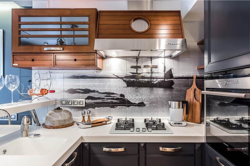 - Кухонный гарнитур белого цвета с отделкой из натурального дерева, которое напоминает корабельную палубу.