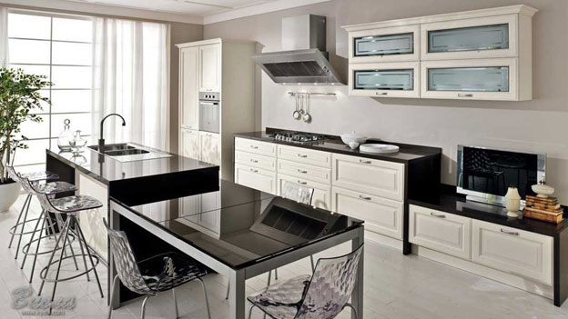 Ключевым элементом, привлекающим внимание, является роскошный кухонный стол, изготовленный из дерева. Его должны окружать большие и красивые стулья, которые добавят роскоши и объемности. Можно использовать барную стойку. Также необходимо применить остекление шкафов, которое сделает акцент на использование.