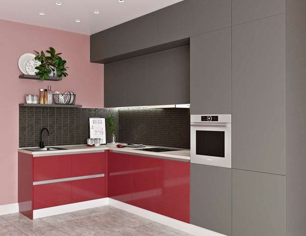 Угловая планировка, темные тона, акцент на бордовый цвет:
