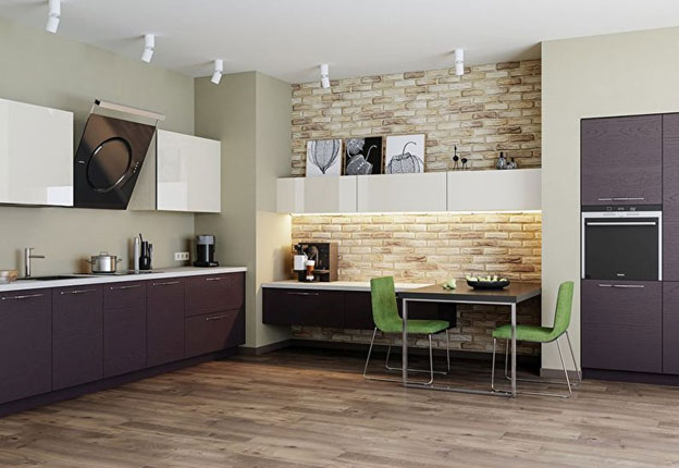 Фартук является неотъемлемой частью, так как отделке необходима защита от жирных пятен. Специалисты рекомендуют использовать каменный фартук, который смотрится дорого и роскошно. Также можно применять стеклянные вставки. Над рабочей зоной можно установить стену из бетона или кирпича, которая создаст акцент на применение.