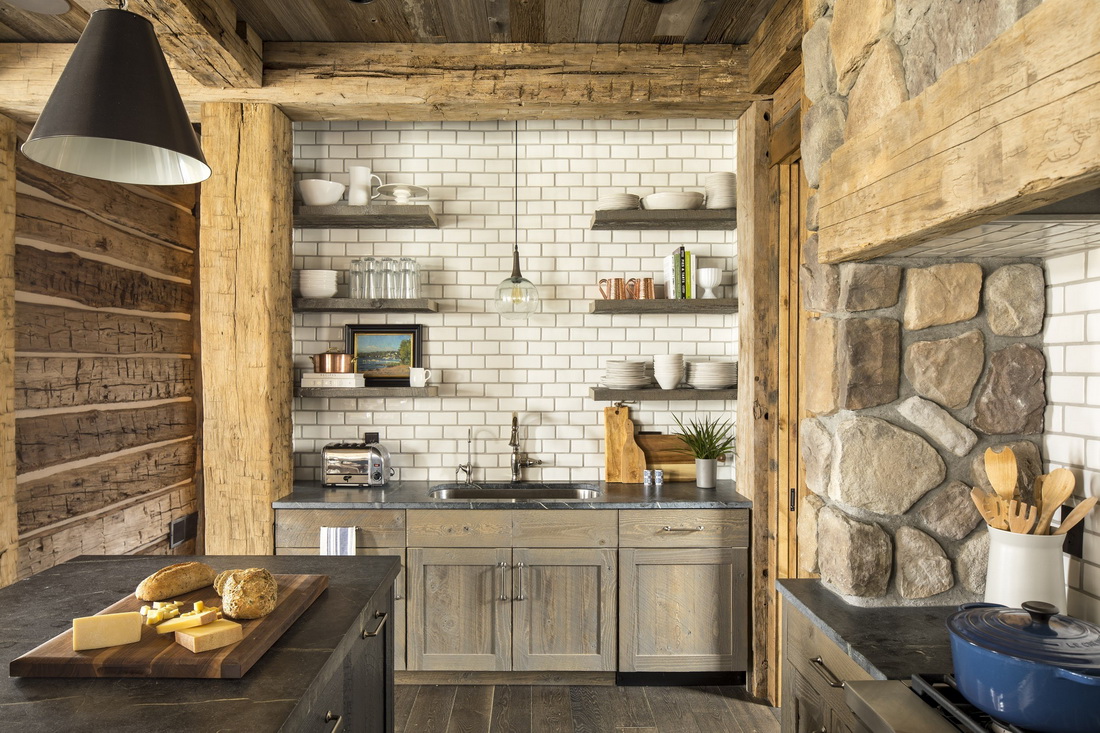 Для отделки кухни в рустике используют камень или дерево. При этом материалы по возможности следует избавить от дополнительной обработки.