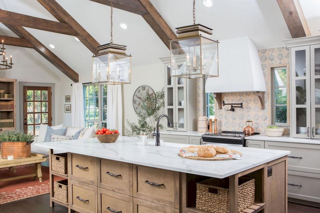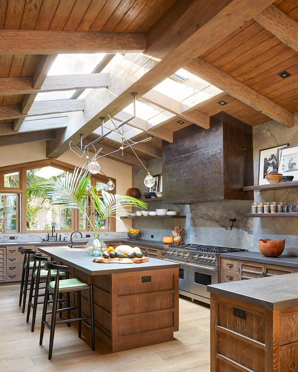 - Потолок кухни оснащают балками или перекладинами из дерева.