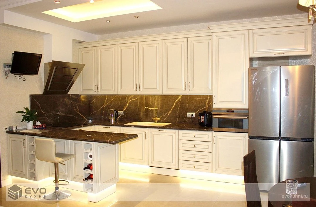 Светлые тона подчёркивают пропорции и детали фасадов, не перегружая пространство. Они визуально расширяют помещение, отражают свет и делают интерьер более лёгким. Для классики это важно: на спокойном фоне лучше читаются филёнки, карнизы и аккуратный декор, а традиционный образ кухни выглядит актуально и в современных проектах.