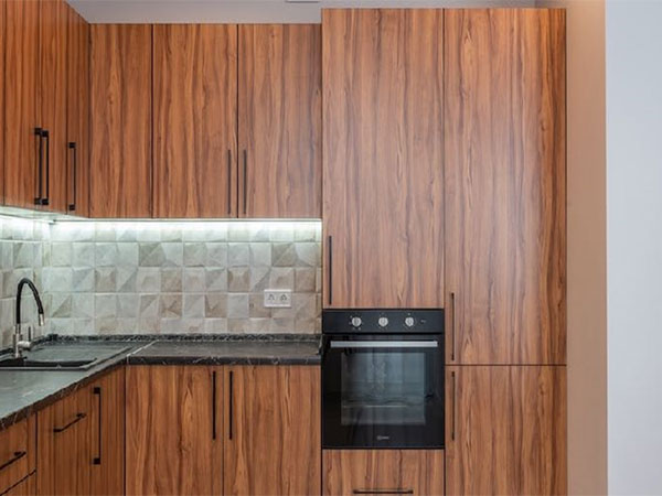 Визуально такой тип фасада можно отличить по виду. Если с одной стороны фасад имеет древесную структуру, а с другой - просто белую сторону, то это ламинированный МДФ. У ламинированного материала четыре вида покрытия - глянцевый, матовый, soft touch (глубокий матовый) и текстурный. Последний отлично повторяет структуру дерева или шелка.