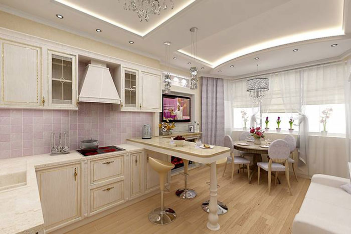 Важную роль в оформлении в классическом стиле играет освещение. Прежде чем объединять кухню и гостиную или столовую в обязательном порядке продумывают тип используемых осветительных приборов. В обеденной зоне будут актуальны люстры из хрусталя, стали и меди. Эффектно смотрятся подвески, текстильные плафоны, которые могут сочетаться со шторами, лампочки в виде свечей.