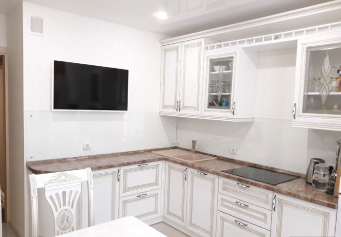 Белый цвет визуально расширяет помещение, поэтому его нередко используют в условиях небольших пространств. Тотально белая кухня навевает мысли о стерильности операционной, поэтому базу разбавляют оттенками золота, бронзы или патиной. Это лучшие компаньоны для белоснежной основы. Они придают классическому дизайну торжественность и изысканность.
