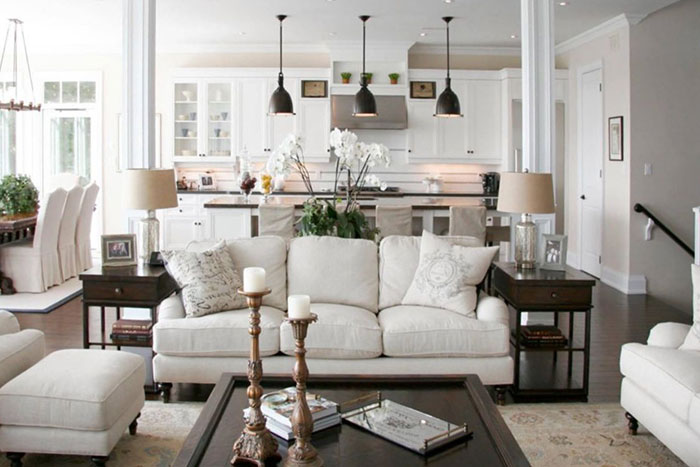 Совмещая кухню и гостиную можно получить единое пространство, улучшающее коммуникации и сокращающее трафик электричества. Разграничить зоны можно с помощью разных видов отделки (напольного покрытия), мебели, освещения. Популярным решением является кухонный остров, который может использоваться одновременно как стол, рабочая поверхность или система хранения.