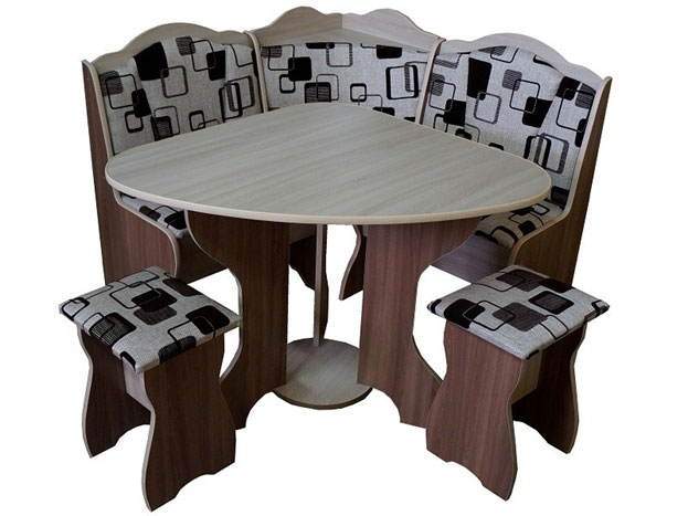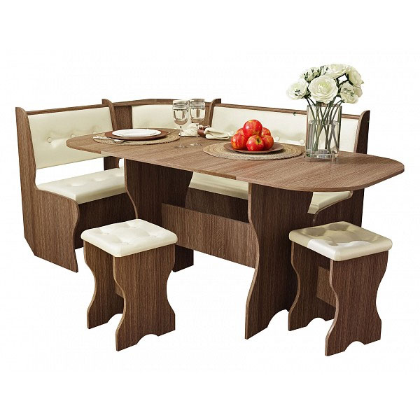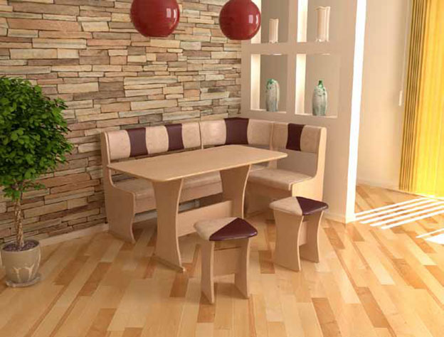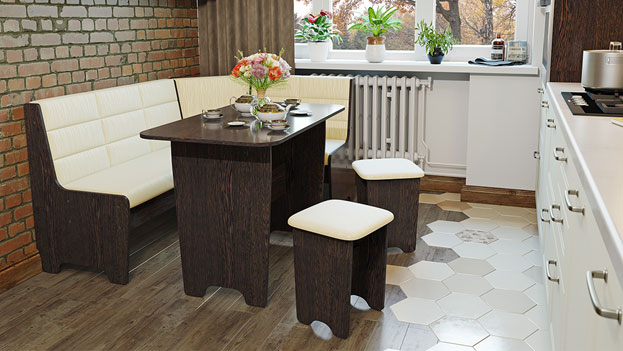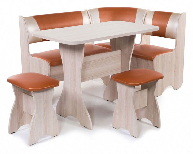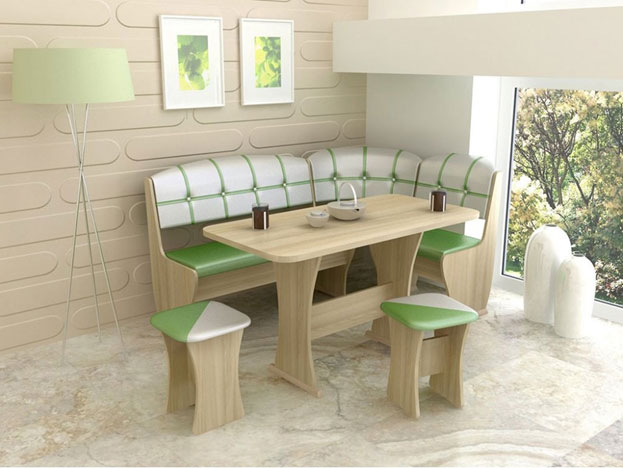 - кухонный уголок в комплекте. В данном случае комплект состоит из дивана, обеденного стола и двух табуретов. Преимущество такого выбора заключается в том, что все единицы дополняют друг друга и сочетаются по стилю;