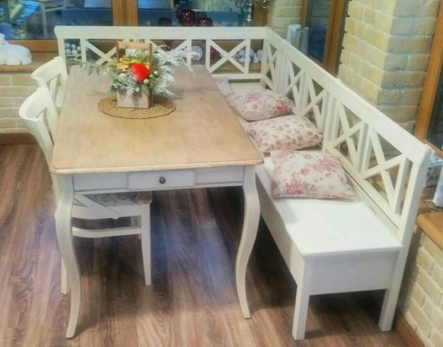Кухонный уголок – это мебель, состоящая из двух частей – корпуса, то есть самого уголка и мест для сидений и спинки. Для изготовления гарнитура используются следующие материалы: