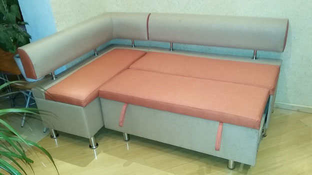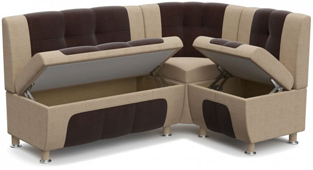 - многофункциональность. Конструкция может дополняться шкафами с выдвижными ящичками, в которых хранится кухонная утварь. Дополнительное место предусмотрено под сидением дивана;