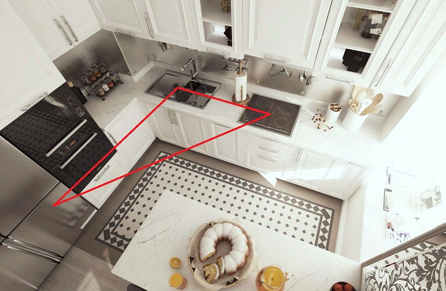 В оригинале его вершинами были рабочая столешница, мойка и плита. Но сейчас первую заменил холодильник. Принцип остался тот же: между «вершинами треугольника» должно быть расстояние не более 1,8 метра. Нарушение правила ведет к суете, переутомлению и регулярному подгоранию пищи.