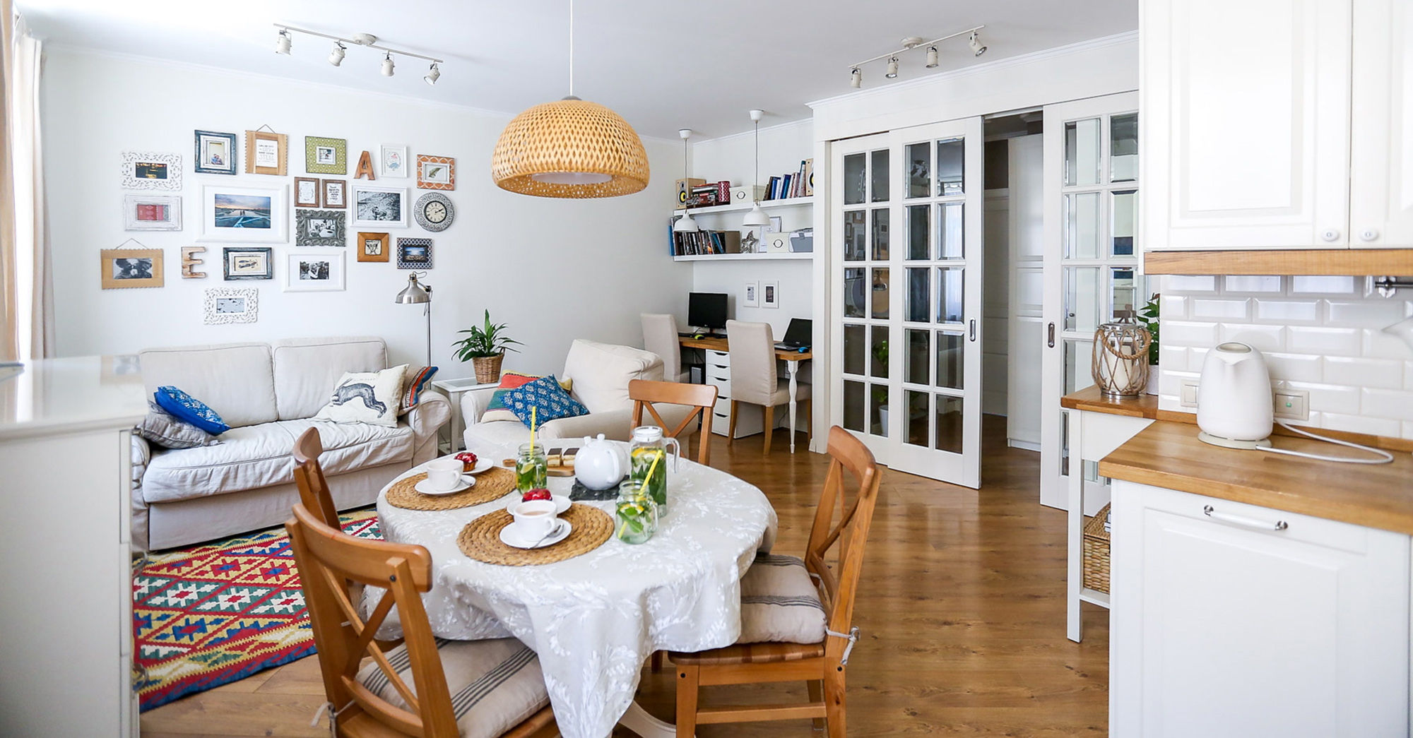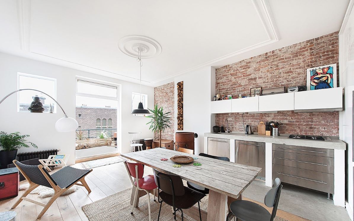 Особенности расстановки предметов мебели во многом зависят от площади и обустройства кухни. Если свободного места немного, подойдут эргономичные раскладные варианты мебели. В просторной квартире или студии ключевым декоративным акцентом можно сделать обеденную зону с большим столом и стульями необычной формы. Любую мебель уместно дополнить текстилем.