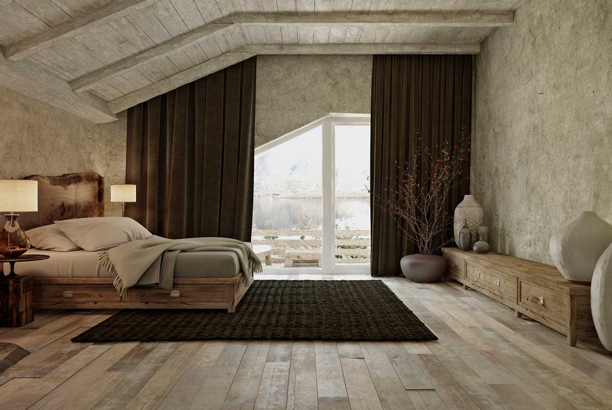 В спальне может выражаться через использование минималистичной мебели, натуральных тканей и светильников с теплым светом. Комната становится местом покоя, где каждая деталь напоминает о прекрасном в простоте.