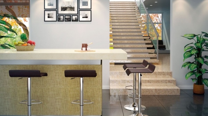 Барные табуреты прекрасно сочетаются со стойкой. Их можно использовать в маленькой кухне для зонирования пространства.