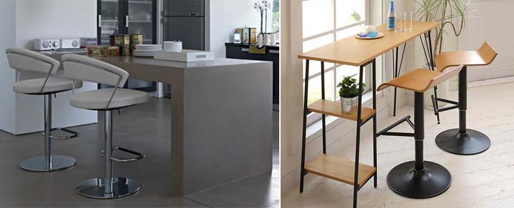 Табуреты или стулья могут быть выполнены из различных материалов: дерева, металла и пластика. Облегчите себе задачу сочетанием этих материалов, подбирая с учетом критериев практичности. Сиденья с мягкой обивкой производят в разных цветах: черном, оранжевом, синем, зеленом, которые можно выбирать на свое усмотрение.