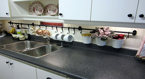 Рейлинги можно изготовить своими руками. Они представляют собой металлическую трубу, которую закрепляют небольшими кронштейнами к верхней части фартука, расположенной над плитой или мойкой. Рейлинги содержат различных габаритов и форм крючки, зажимы, прищепки держатели. Благодаря инновациям в таких системах, появилась возможность использовать вместо металлических труб полки-трансформаторы с крючками и креплениями.