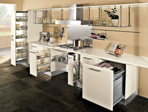 Внутри выдвижных конструкций в столах-тумбах размещают различные банки, бутылки, мелочевку. Назначение этих систем – скрыть то, что делает кухню неуютной.