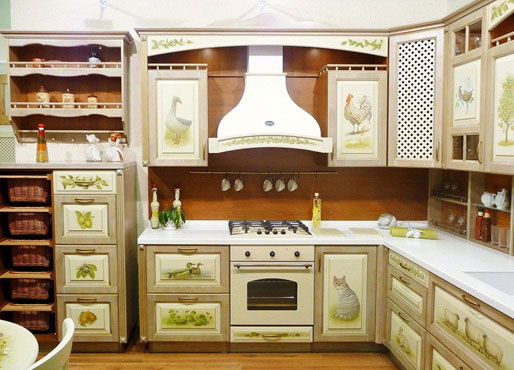 2. Декоративные, оригинальные принты текстиля или оформления стен придадут кухне теплоты и экспрессивности. Удачным решением будет сделать акцент на деталях – рабочую зону оборудовать редкими приспособлениями.