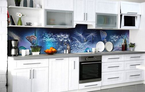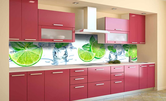 Если одноцветный кухонный фартук надоел – влагоустойчивыми наклейками можно декорировать поверхность. Декором могут быть: