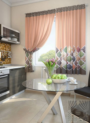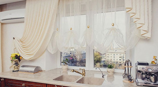 Для окон кухни обычно подбираются светлые занавески ли шторы.