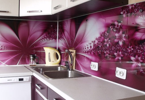 - Скинали – прочнейшее закаленное декорированное стекло. Из него создают красивые панели с цветной печатью.