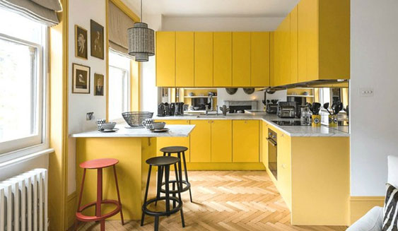 Чтобы создать стильное пространство – используются подсветки, прикрепленные к мебели, раковине, а также настенные бра. Отличным решением станет использование желтого цвета для оформления помещения – он улучшает аппетит, настроение, повышает мозговую активность.