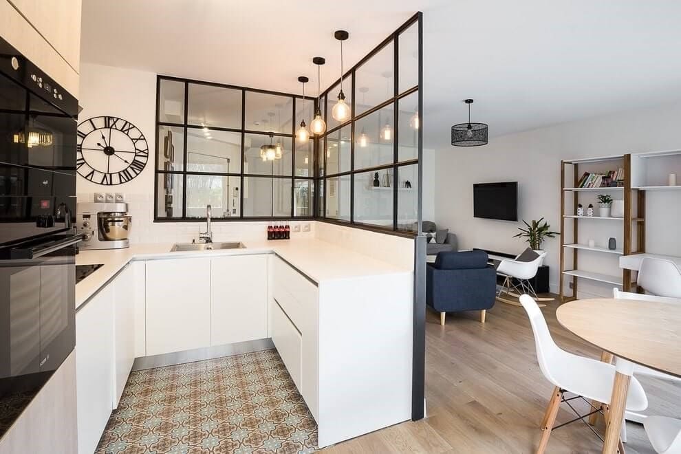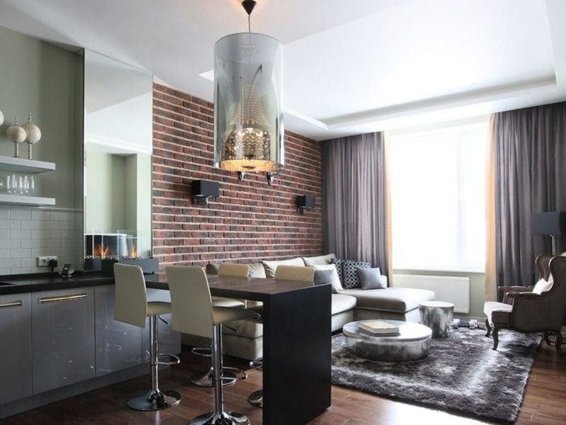 Современный дизайн помещения помогает сделать проходную особенность не недостатком, а достоинством пространства. Для кухонной зоны не рекомендуют использовать темный тон. Главная цель — сделать дизайн легким, добиться воздушности. Если в помещении есть плотные перегородки, их лучше заменить стеклянными изделиями.