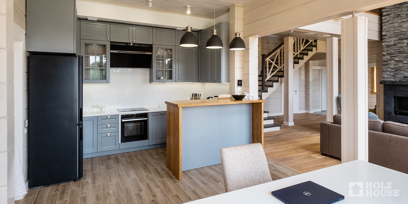 Если не продумать освещение, проходная кухня будет выглядеть как темный коридор. Поэтому в частном доме нужно предусмотреть достаточный искусственный свет. Гостиную и соединенную с ней кухню можно осветить по периметру встроенными лампами. Их можно подобрать в интернете через онлайн магазин или в шоуруме в Москве. Для кухни-гостиной лучше подбирать функциональную мебель, расставлять ее точечно, чтобы задействовать пространство максимально. Все источники света должны быть миниатюрными. От больших люстр стоит отказаться.