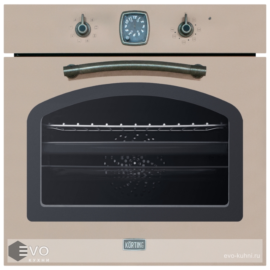 Электрический духовой шкаф Korting OKB 481 CRSK – стильная модель в бежевом цвете, аналоговые часы Franck Muller и поворотные переключатели цвета «состаренное серебро» подчеркивают ретро-дизайн. Телескопические направляющие обеспечивают устойчивое положение тяжелых противней, а функция автоматического отключения защищает духовой шкаф от перегрева.