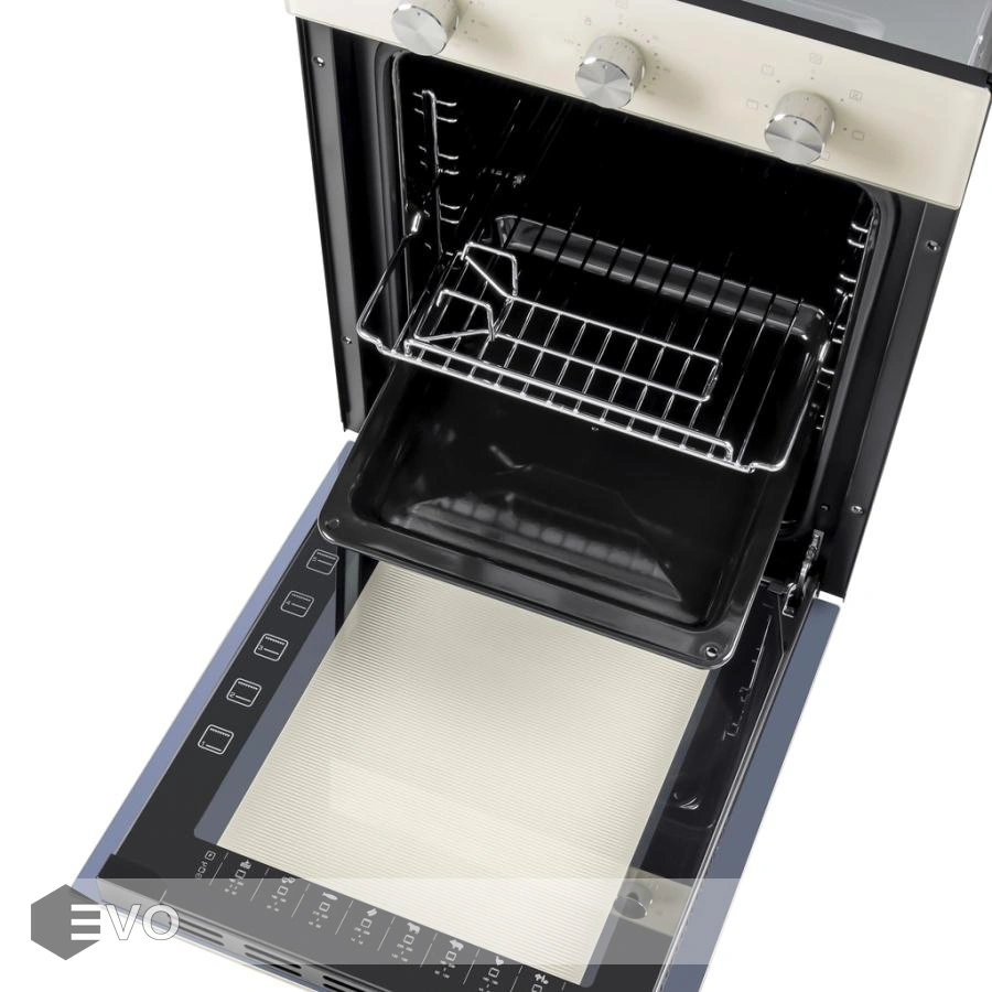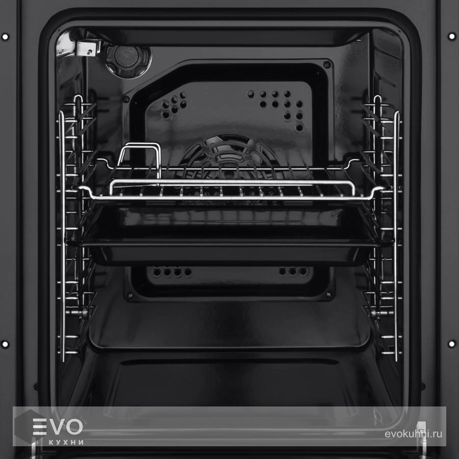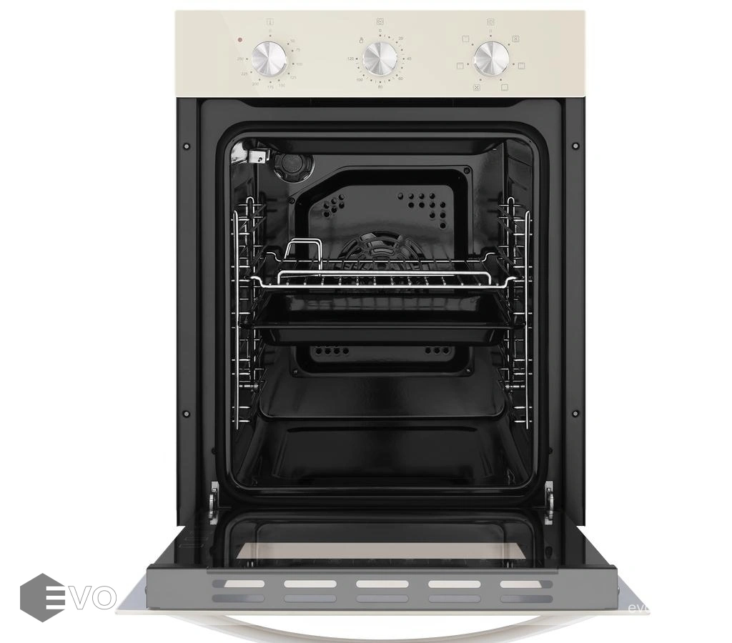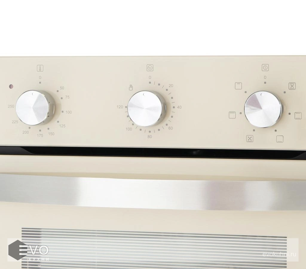 Механическое управление работой духовки осуществляется поворотными ручками. Можно установить таймер (до 120 мин), выбрать температуру (50°-250°C) и один из 7-ми режимов работы: внутреннее освещение, традиционный нагрев, большой гриль, конвекция с нижним нагревом, нижний нагрев, конвекционный нагрев, малый гриль.